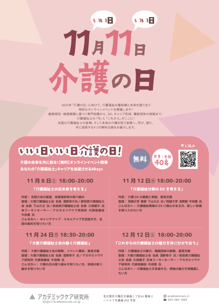 2025.10.21~『介護の日』イベントのお知らせ~2025年「介護の日」に向けて、介護福祉の最前線と未来を語り合う特別なオンラインイベントを開催します!義務規定・倫理綱領に基づく専門知識から、DX、キャリア形成、職能団体の挑戦まで、介護福祉士の「今」と「これから」がここに!全国の介護福祉士の皆様、そして未来の介護を担う皆様へ。学び、語り、共に成長する4つの無料企画をお届けします。kaigonohi20250925 完成ダウンロード 第37回奈良県老人福祉施設職員研究会議 開催のお知らせ前の記事